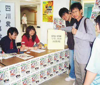 中新網(wǎng)5月22日電 “10元、百元不嫌少,援助災(zāi)民要趁早!”四川震災(zāi),讓來自南投九二一災(zāi)區(qū)的玄奘大學(xué)教育人力資源系學(xué)生蕭楷庭感同身受,學(xué)生社團(tuán)發(fā)起愛心救災(zāi),他毫不猶豫捐了1000元(新臺幣,下同)的零用錢。