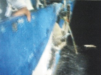 李慶華昨天還公布了由“聯合號”上一名釣客在事發前后所拍攝的一卷錄像帶,畫面中看出日艦“PL123”是在“聯合號”右側后方平行航行,隨后卻從右側擦撞,海釣船船身中央立即出現一個大洞。何鴻義到機房查看,發現進水狀況嚴重,下令全體釣客與船員放下救生筏棄船逃生,當時日艦就在距離聯合號約數十米處以探照燈監視。