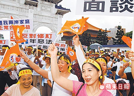 資料圖:2007年是兩岸通婚二十周年,有超過二十五萬名大陸配偶在臺灣生活。但由于當局的限制性政策,大陸配偶在島內的權利難以得到保障。07年12月21日,“中華兩岸婚姻協調促進會”在“移民署”門前集會,申要人權與平等待遇。 中新社發 陳國華 攝