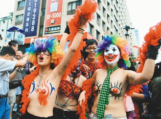 鼓吹素食主義的“素食男兒”,打出“給我男體,不要尸體”口號(hào),連推車(chē)都是回收紙箱制成,環(huán)保做得很徹底;二度上街的“Bi the Way”標(biāo)語(yǔ)“我們是雙性戀”寫(xiě)得斗大,姿態(tài)比去年更突出;壓軸的男同性戀游泳隊(duì)“水男孩”也依然廣獲喝采掌聲。