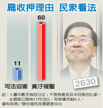 中新網(wǎng)11月13日電 臺(tái)檢方聲押陳水扁,臺(tái)北地方法院合議庭裁定對(duì)其收押禁見(jiàn),引發(fā)卸任領(lǐng)導(dǎo)人戴手銬、法警打人爭(zhēng)議。臺(tái)灣《聯(lián)合報(bào)》民意調(diào)查發(fā)現(xiàn),僅28%臺(tái)灣民眾主張給予陳水扁卸任領(lǐng)導(dǎo)人禮遇,只有8%民眾相信法警打人。而逾六成民眾認(rèn)為陳水扁被收押是因?yàn)樨澪凼伦C確鑿,僅11%民眾主張是司法迫害。