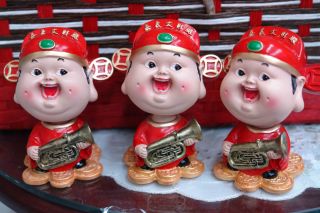 文財?shù)畛脵C(jī)也結(jié)合嘉義市正在舉行的國際管樂節(jié),推出一套五尊的可愛財神爺祈福公仔。戴著財神帽的公仔,頭部可以靈活晃動,手上則是拿著法國號、薩克斯風(fēng)等樂器,造型極為逗趣。