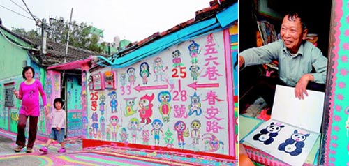 中新網(wǎng)4月7日電 據(jù)臺(tái)灣《聯(lián)合報(bào)》報(bào)道,臺(tái)中市有處五彩繽紛的彩繪眷村,墻面、地板畫(huà)滿人像、動(dòng)物與色塊,夢(mèng)境般場(chǎng)景吸引大批博客、攝影玩家,孤寂的眷村頓時(shí)熱鬧起來(lái);這些圖畫(huà)都出自86歲退伍老兵黃永阜之手,他說(shuō),畫(huà)圖是排遣無(wú)聊,沒(méi)想到大家喜歡,讓他越畫(huà)越起勁。
