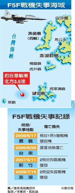 2009年7月15日編號5410的F-5F戰(zhàn)機,在澎湖石礁靶場執(zhí)行空對地炸射訓練失事,飛官黃挺瑜中尉和張良元中校失蹤。