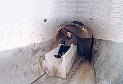 兩條密道皆為二點(diǎn)三米寬,二點(diǎn)一米高,造型有如螺旋式走道,一路向下盤旋,若不小心可能就會摔個大跤,寬度可容納二至三人同時并行。最特殊的是,西側(cè)的密道旁,還設(shè)計成約一人寬,以磨石子為底,類似溜滑梯的滑行道。飯店說法是,這種設(shè)計便于讓行動不便的人員使用。由于滑道兩端距離約七十米,又是一路往下盤旋,看過的飯店人員戲稱,這大概是世界最長的“水泥溜滑梯”。