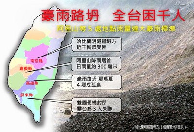 截至23日晚間9點,全臺降雨前五名地區(qū)分別是阿里山287毫米、高雄縣桃源鄉(xiāng)御油山241毫米、南投信義鄉(xiāng)神木村218毫米、臺中縣和平鄉(xiāng)雪嶺211毫米、高雄縣桃源鄉(xiāng)溪南211毫米,都達到大暴雨標準(24小時累積雨量達200毫米以上)。