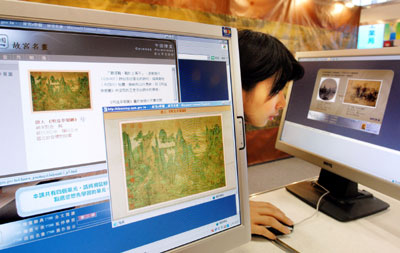 中新網(wǎng)10月23日電 據(jù)“中央社”報(bào)道,數(shù)字學(xué)習(xí)科技成果展二十三日在臺(tái)北世貿(mào)展覽館一館舉行。圖為臺(tái)北故宮博物院展出在線名畫欣賞教學(xué)。