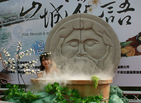 臺(tái)灣高雄縣溫泉餐飲業(yè)者推出“山城花語(yǔ)溫泉季”活動(dòng),四日記者會(huì)中的辣妹泡湯,凸顯活動(dòng)主題!爸醒肷纭眻D 陳守國(guó) 攝