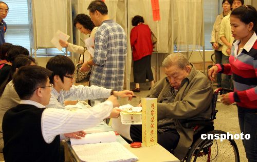一月十二日是臺灣第七屆“立委”選舉日,一位有障礙人士坐輪椅到所在選區的投票所領取選票,參加投票。