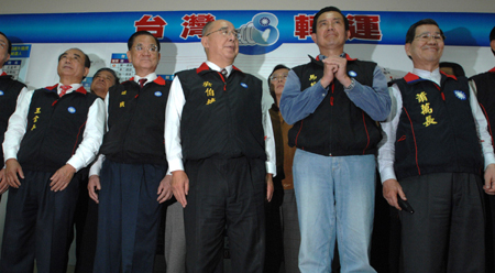國(guó)民黨在十二日“立委”選舉中大勝,國(guó)民黨中央黨部晚間舉行記者會(huì),黨主席吳伯雄表示不敢懈怠,高興只要一晚就好,接下來(lái)還有“大選”要拼。國(guó)民黨“大選”參選人馬英九則拱手感謝民眾支持。“中央社”圖 王飛華 攝