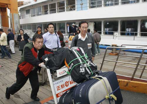 臺灣地區領導人選舉前夕,金門小三通航線十九日受濃霧影響,中午過后才通航,水頭碼頭涌現搭船入境旅客,大多是返鄉投票的臺商。(“中央社”圖;倪國炎/攝影)