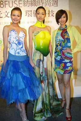 臺(tái)灣民間信仰媽祖,現(xiàn)在有了美麗的代言人。臺(tái)灣官方主辦的“FUSE紡織時(shí)尚周”活動(dòng)結(jié)合“大甲媽祖國際觀光節(jié)”,從全省兩百位十六至二十四歲的報(bào)名者中選出前三名,成為臺(tái)灣首屆媽祖代言人,二十五日公開亮相,圖為前三名王婷儀(左起)、葉雅馨、陳紫嫻,看似夸張的馬甲,是設(shè)計(jì)師以媽祖護(hù)佑臺(tái)灣有如穿著盔甲為靈感,而鎮(zhèn)瀾宮的澡井、八仙彩甚至是媽祖供桌上的青花瓷花瓶,都幻化做時(shí)尚媽祖的彩衣。臺(tái)灣《中國時(shí)報(bào)》圖 陳信翰 攝
