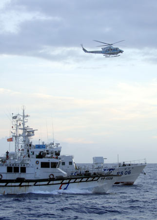 臺灣保釣人士以海釣船前往釣魚島宣示“主權”,十六日清晨當保釣船只接近釣魚島海域時,臺灣巡防艇(前)與日本保安廳巡邏艇(后)相互對峙,不讓日本船只接近保釣船,空中還有日本直升機沿途監視。整個釣魚島海域布滿雙方海防艦艇,情形緊張中相互又頗節制。“中央社”圖