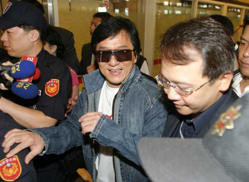 香港藝人成龍(中)十八日應邀來臺出席公益活動,由于他曾經批評過2004年臺灣“大選”,有十余人至機場抗議,成龍在航警和私聘保全人士的保護下通過入境大廳。(“中央社”圖)