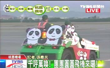 運輸贈臺大熊貓“團團”、“圓圓”的臺灣長榮班機下午5時許抵達桃園機場,圖為桃園機場的車輛被打扮成熊貓風格。 臺灣TVBS圖