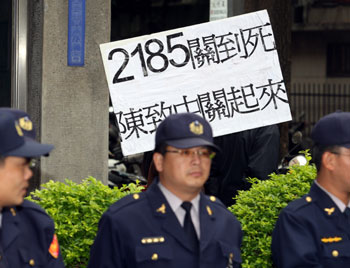 臺(tái)北地方法院21日審理陳水扁家庭洗錢案,庭外有民眾舉牌“把陳致中關(guān)起來” “中央社”圖