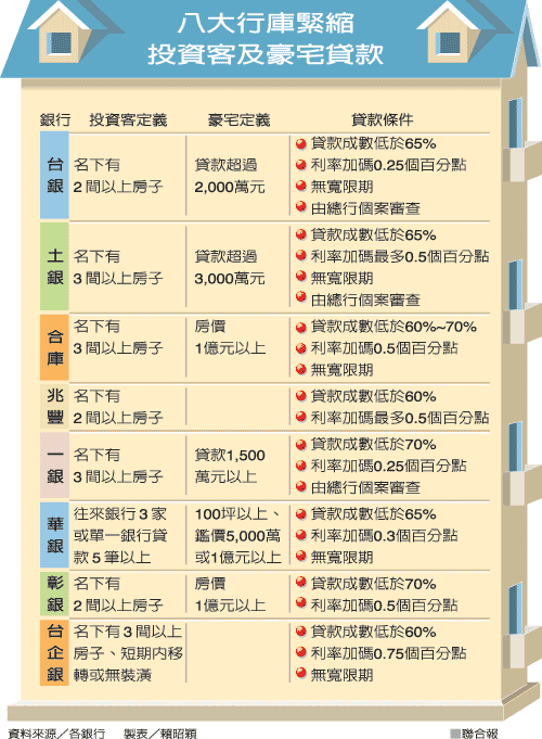 對投資客最嚴的是臺灣企銀,董事長羅澤成說,只要個人名下有三間以上的房子,符合房子未裝潢、短期移轉等條件,利率將大幅加碼0.75個百分點,貸款成數(shù)上限也只有六成,同時取消寬限期。