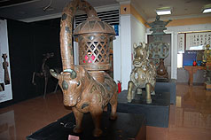 山莊內(nèi)展出的三星堆(東漢光武帝)青銅古文物,系明月居總監(jiān)黃春隆的珍藏品,以青銅器為主,包括天祿、馬車、春秋時代的編鐘、銅牛燈等數(shù)百件。