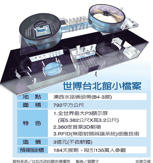 中新網3月31日電 據臺灣《聯合報》報道,上海世博會已進入倒數階段,備受注目的臺北館的主題是“3D、互動、新科技”。參觀者將乘坐升降電梯,模擬101高速電梯,透過實景360度3D劇場欣賞臺北景點,還可透過RFID(無限射頻辨識系統)隔空與臺北景點合照,展現科技的神奇力量。