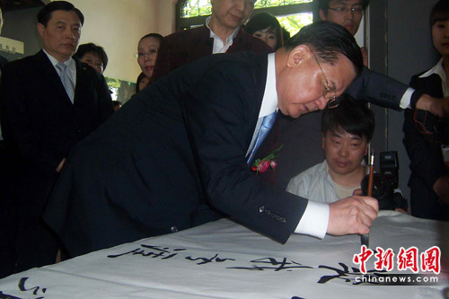 中新網杭州5月2日電(記者 汪恩民)5月2日,“朱炳仁、楊奉琛兩岸兩人藝術展”在杭州西湖博覽會博物館開幕,中國國民黨榮譽主席連戰出席了開幕儀式并親筆題詞道賀。
