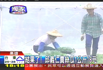 中新網(wǎng)7月20日電 據(jù)臺灣TVBS報道,臺當局前“國安會秘書長”邱義仁5月初南下高雄務農(nóng),經(jīng)過2個多月,他種的絲瓜現(xiàn)在已經(jīng)結(jié)實累累,3天前邱義仁開始采收,10多箱的絲瓜經(jīng)由產(chǎn)銷班賣到臺北,1公斤的價格大概新臺幣18元,邱義仁的好友戴振耀說,受到臺風影響,價格不算好,不過總算是邱義仁當農(nóng)夫交出的第一張成績單。