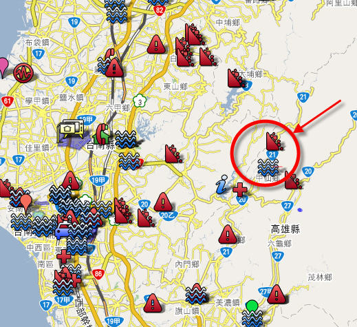 據臺灣《聯合報》報道,高雄縣的六龜鄉草南村、甲仙鄉小林村及旗山鎮南寮巷三十多戶村民,昨天疑遭土石流淹沒。六龜鄉中興村傳八民宅遭土石流淹沒,脫險的高雄縣消防局第三大隊長蘇定國說,十六名住戶生死未卜。