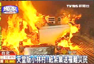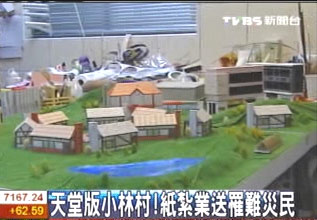 中新網(wǎng)9月4日電 臺灣“八八水災”毀了高雄縣小林村,3日正逢中元節(jié),臺北縣有家專門制作“天堂配件”的紙扎公司,為讓死者安息,連夜趕工蓋出“天堂版小林村”,里頭除了住家、學校以及商店街,希望火化后,能讓不幸的罹難者,在天上有棲身之地。
