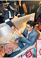 中新網11月16日電 據臺灣《蘋果日報》報道,日前吃牛糞抗議美國牛肉進口的臺大社會學研究所博士班學生朱政騏,前晚開始在“立法院”大門口前躺棺絕食抗議美牛進口,被警方以違反“未依規定在道路堆放雜物,妨礙通行”為由開罰。