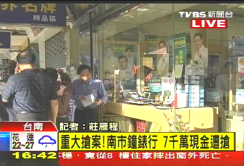 中新網11月23日電 據臺灣TVBS報道,臺南市一家鐘表行老板,23日下午到銀行提領新臺幣7000萬元現金,準備買黃金用,沒想到回家途中遭歹徒尾隨,回到店內時歹徒開槍搶走現金,流彈還意外波及在店內的老板侄女,侄女小腿中彈,送往成大醫院急救,歹徒則逃逸無蹤。