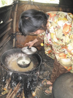 簡陋破落帳篷搭在香蕉園里,卓姓夫妻與兒子擠在不到兩坪的空間里;室內(nèi)堆放著臟亂衣物等用品,睡覺的地方用木板稍隔開,陳設(shè)比起工寮還要簡陋。緊鄰廚房僅有一只燒柴鍋子,卓家女主人鍋子正在蒸蛋,蒸蛋的水暗沉,她說:“這是早餐。”