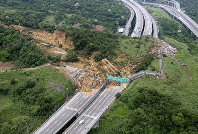 據悉,山崩地點范圍從北二高南下3.1公里至北上2.8公里處,土石覆蓋雙向路面的長度達300米,土石量總重超過20萬噸,南北交通中斷。