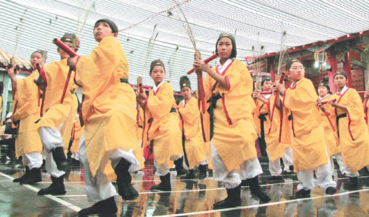 中新網9月28日電 據臺灣《聯合報》報道,南投縣各界紀念大成至圣先師孔子2559周年誕辰釋奠大典,27日上午在埔里鎮昭平宮育化堂孔廟舉行,特別的是,擔綱六佾舞“佾舞生”的育英小學首開縣內先例,36名佾舞生中,小學六年級女生就占了19位。