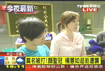 報道稱,一名年約30歲的女子突然拉扯顏圣冠的馬尾,楊蕙如上前制止時,遭到抓傷,2人隨即到仁愛醫(yī)院驗傷,幸好只是輕傷,不過都受到驚嚇,到警察局制作筆錄。