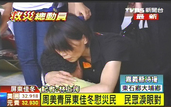 周美青努力安撫每位災(zāi)民,好幾位民眾一度都忍不住放聲哭泣,和周美青相擁在一起,周美青也緊緊的抱著他們,心情也跟著難過(guò)。