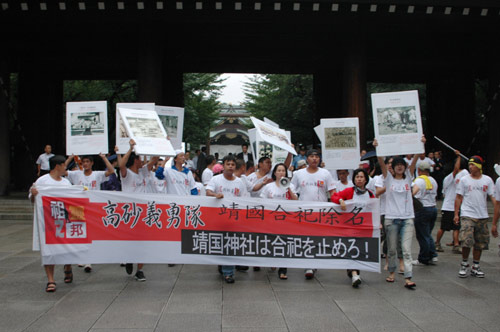 8月11日,高金素梅一行于上午9時(shí)30分左右搭車(chē)出其不意地抵達(dá)靖國(guó)神社,隨即高舉“要求靖國(guó)還我祖靈”等大型橫布條標(biāo)語(yǔ),浩浩蕩蕩地列隊(duì)走向靖國(guó)神社的正殿,并高喊口號(hào)。靖國(guó)神社的警衛(wèi)人員前往阻擋,企圖奪走標(biāo)語(yǔ)布條,雙方發(fā)生肢體沖突。