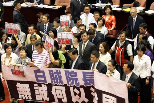 據臺灣媒體報道,吳敦義上午就來到“立法院”準備報告施政方針,但還沒上臺,事前保密到家的民進黨“立委”們,突然拿著白布條、標語霸占主席臺,大喊“白賊義,道歉”,稱吳敦義香港行的說法一變再變,有誠信問題。吳敦義則留在原位,國民黨人上前安撫,也做護駕動作,避免與民進黨“立委”發生肢體沖突。