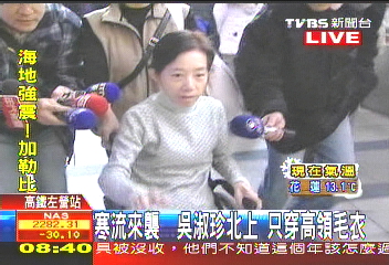 中新網(wǎng)1月13日電 據(jù)臺(tái)灣TVBS報(bào)道,超強(qiáng)寒流襲臺(tái),陳水扁夫人吳淑珍13日搭乘高鐵北上出庭,對(duì)于兒子、兒媳上電視接受專訪,她表示尊重他們。