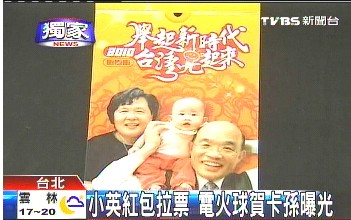 中新網2月1日電 據臺灣TVBS報道,春節腳步逼近,民眾喜歡紅包賀卡沾沾喜氣。綠營政治明星蘇貞昌特別準備招牌“電火球”卡片,寶貝小孫女照片第一次公開亮相;而民進黨主席蔡英文也有“圓滿”紅包,和各區“立委”參選人一起具名。