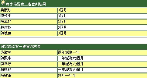 臺北地方法院去年9月1日一審判刑吳淑珍1年,陳致中和趙建銘、陳幸妤夫婦均判6個月,陳敏熏被判1年6個月。