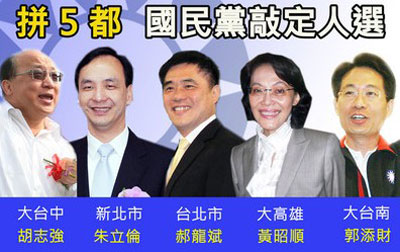 中新網(wǎng)5月11日電 綜合臺灣媒體報道,國民黨中央提名審核委員會11日決定“五都”征召人選,國民黨秘書長金溥聰宣布臺北市、新北市、大臺中、大臺南、大高雄分別征召臺北市長郝龍斌、“行政院副院長”朱立倫、臺中市長胡志強、前“立委”郭添財、“立委”黃昭順代表國民黨參選。
