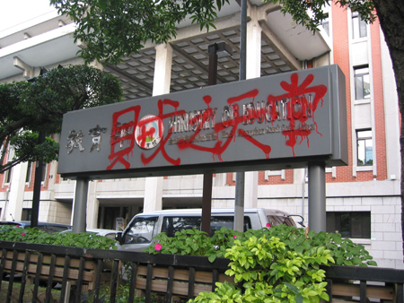 臺"教育部"牌匾被抗議者噴漆"賊之天堂"(圖)