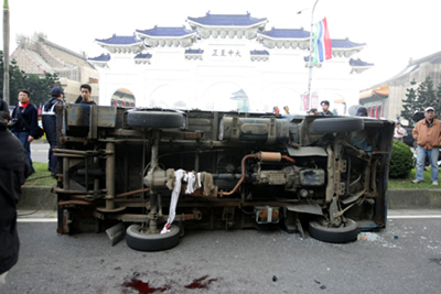 中新網(wǎng)12月6日電 臺(tái)北中正紀(jì)念堂前發(fā)生意外。上午十一時(shí)左右,有男子駕駛貨車沖撞“大中至正”門口的人群,其中一名正在采訪的記者受重傷。