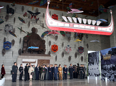 據臺灣中廣新聞報道,進入主建筑物的二樓銅像大廳可以看到,蔣介石銅像仍維持原貌,但整個大廳裝飾了巨幅海報與歷史政治運動照片等,還垂掛風箏以及“原住民“達悟魚舟紙做模型。