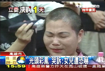 中新網(wǎng)1月11日電 國(guó)民黨女“立委”侯彩鳳因?yàn)椴粷M對(duì)手頻頻放出風(fēng)聲,指她買票,在今天做出無(wú)言的抗議,在馬英九及選民面前,剃光頭抗議。