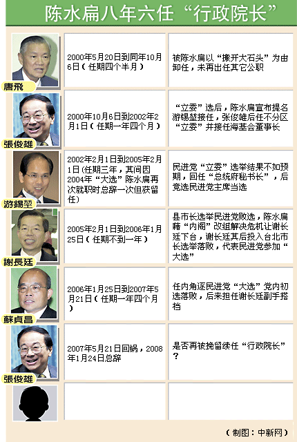 新聞資料:陳水扁八年歷經六任“行政院長”