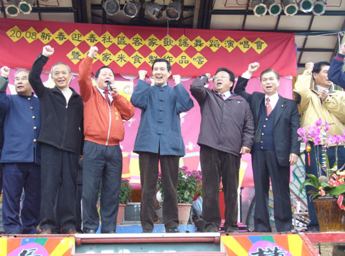 隨后馬英九到路口廣場與鄉親同樂,與大家一起高歌“我們都是一家人”,馬英九開始發放裝有巧克力金幣的小紅包,馬英九希望大家能在新的一年“萬馬奔騰、曙光再現”。