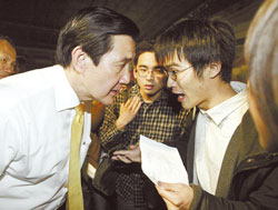 不過,當座談進入嚴肅的教育、社會福利、兩岸問題,馬英九馬上變身成“馬教授”身分,一板一眼。馬英九并期許大學生“更用功一點”,“希望各位為了自己、為了臺灣能更用功。”“格局更大一點。”