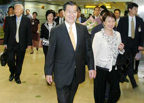 蕭萬長率領“兩岸共同市場基金會”代表團一行是在十一日上午搭機經由香港前往海南,同行的有淡江大學教授蘇起、臺積電董事長張忠謀夫婦、華新麗華董事長焦佑倫和臺灣水泥董事長辜成允等人。