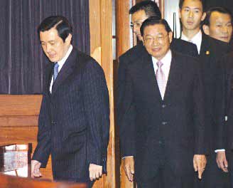 馬英九10晚在5.20后首次出席海基會臺商端節(jié)聯(lián)誼活動晚宴,與今天赴大陸展開兩會復談的海基會董事長江丙坤一同進入會場。 聯(lián)合報圖