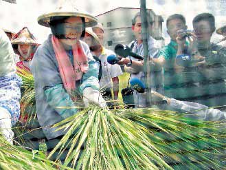 從未割過稻的蔡英文,跟著農(nóng)民左手抓起一把稻穗,接著右手以鐮刀割下,一開始動(dòng)作有些生疏,第二次即有模有樣,她興奮地將自己的收成高高舉起,成為鏡頭獵取對(duì)象。
